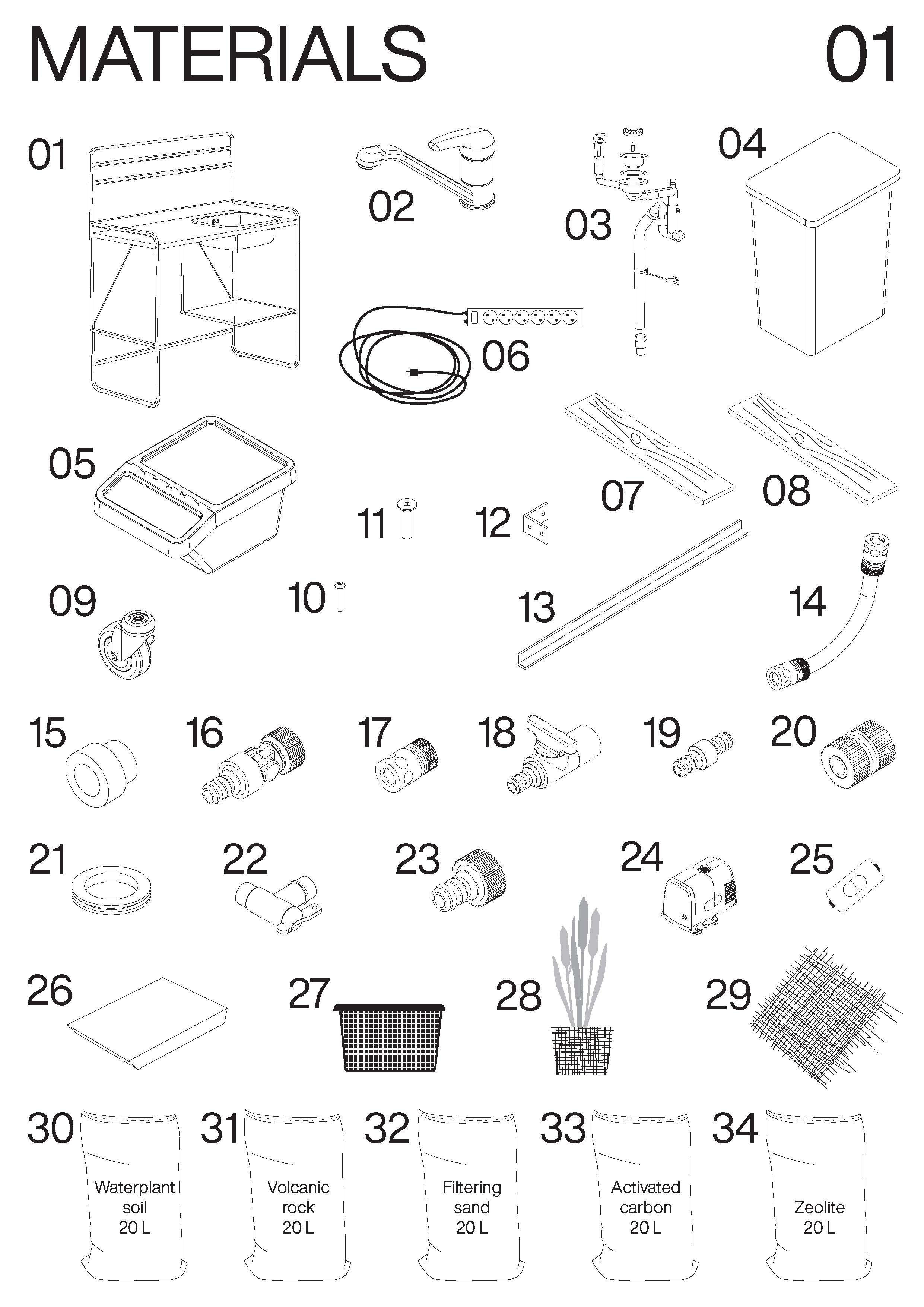 This entire system is disconnected from the water grid, operates using integrated water tanks, plants, and substrates, and was built using standard parts and