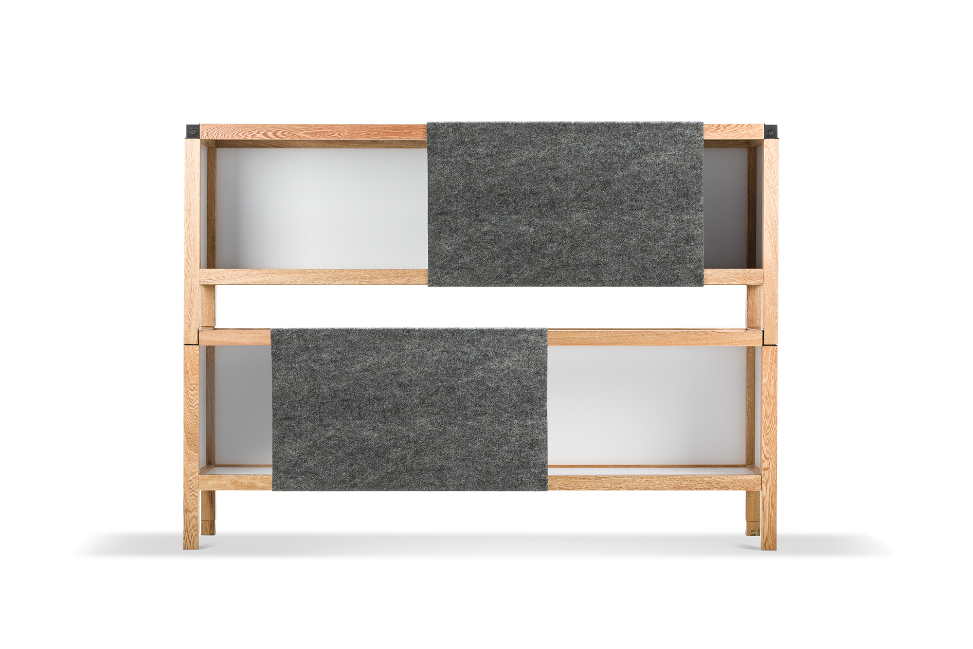 Stackable shelving system with a sliding door supported by magnets. The magnets are inserted within the wooden frame, that support a metal plate embedded between two felt layers that work as sliding doors. The doors can be taken off and magneto looks clean with no trace of rails . The corners are made out of a metalic piece that enables magneto to stack modules together.